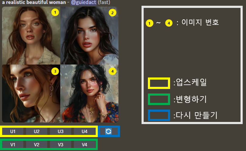 - U1 ~ U4: 업스케일(퀄리티 높이기): 선택한 이미지를 고해상도 이미지로 변환하여 선명하고 자연스러운 결과물로 만듭니다.