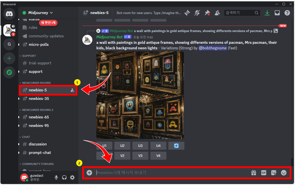 ②채팅 입력 창은 미드저니에게 생성할 이미지를 텍스트화여 설명해주는 곳이에요.
